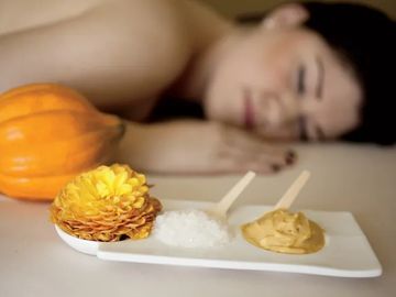 Custom massage + sweet orange aromatherapy + warm pumpkin spice oil + pumpkin spice buttercream hand & foot massage + steam towels